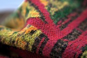 紅葉が始まった黒部峡谷をモチーフにしたニットブランケット。緑とオレンジが混ざり合う、秋のはじまりの色を編みこんだデザイン。